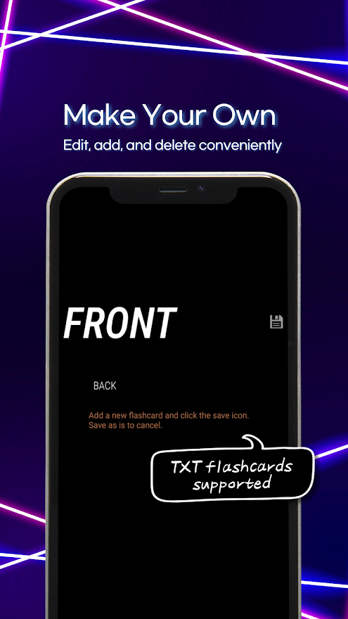 You can import your customized TXT flashcards! You can also add/remove and edit flashcards at ease, if you want to change just a bit.